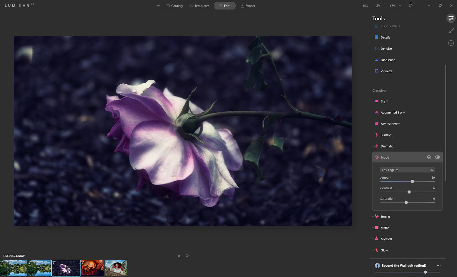 In Luminar AI In Edit scroll down to the Creative Panel and select Mood. You will see a little arrow allowing for selections. Choose your favourite look and apply it. You can preview different LUTs by hovering over the name. Then once selected you can alter amount, contrast and saturation.