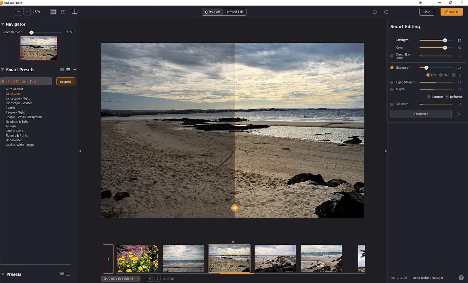From the above photo, you can already see a marked improvement. The Quick edit will detect the type of image, like a Landscape and then edit according to various AI algorithms. You can lower the strength (or intensity) of this edit, and alter the colour and even the exposure. Simple, quick and already such an amazing difference, bringing out all the details in the shadows and highlight recovery in the sky. And you could leave it all there. Select Save All (top right-hand side) and they are all back in Lightroom with these corrections. If you imported directly into Radiant Photo, you can save all and choose how to save, where to save etc.
