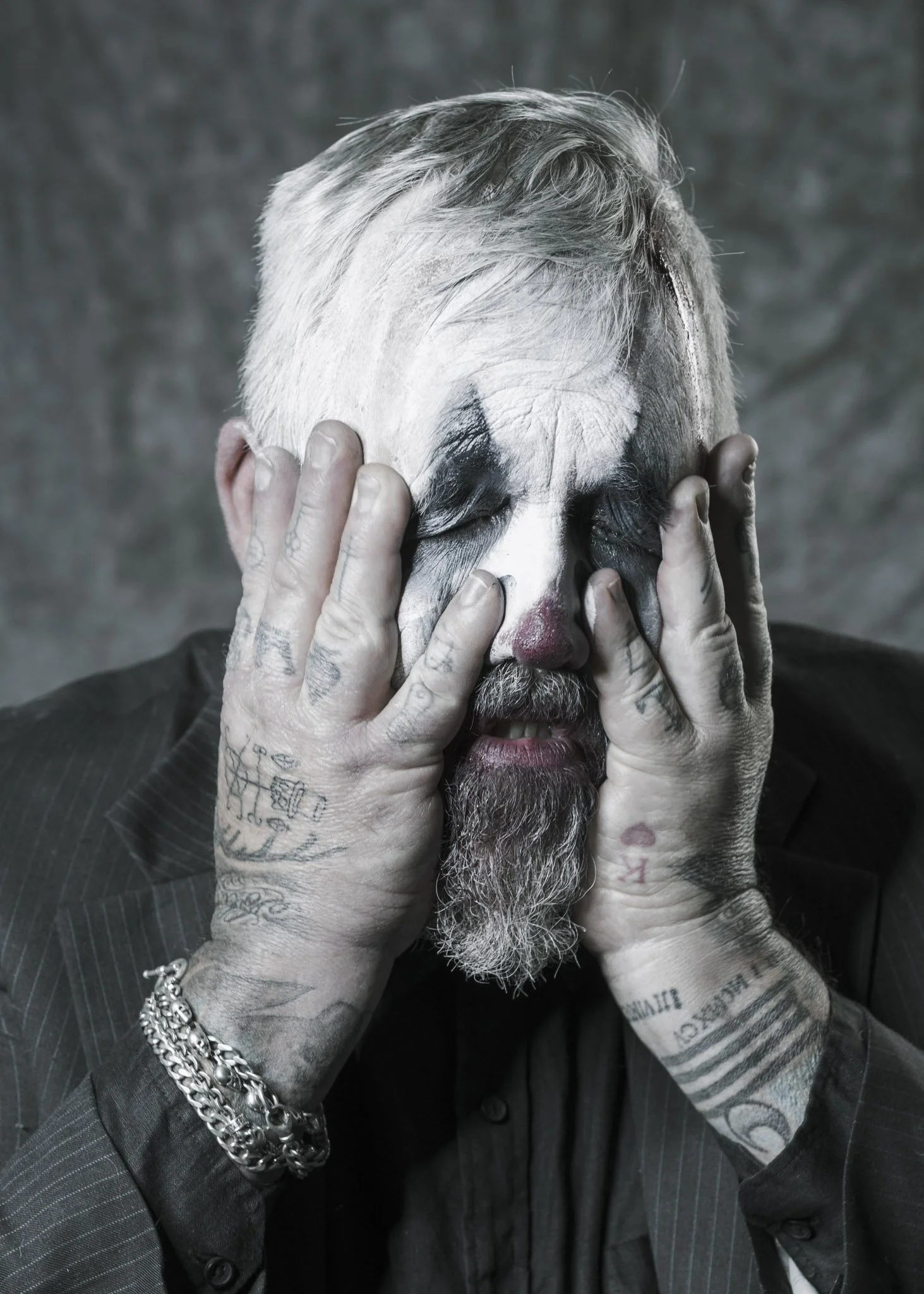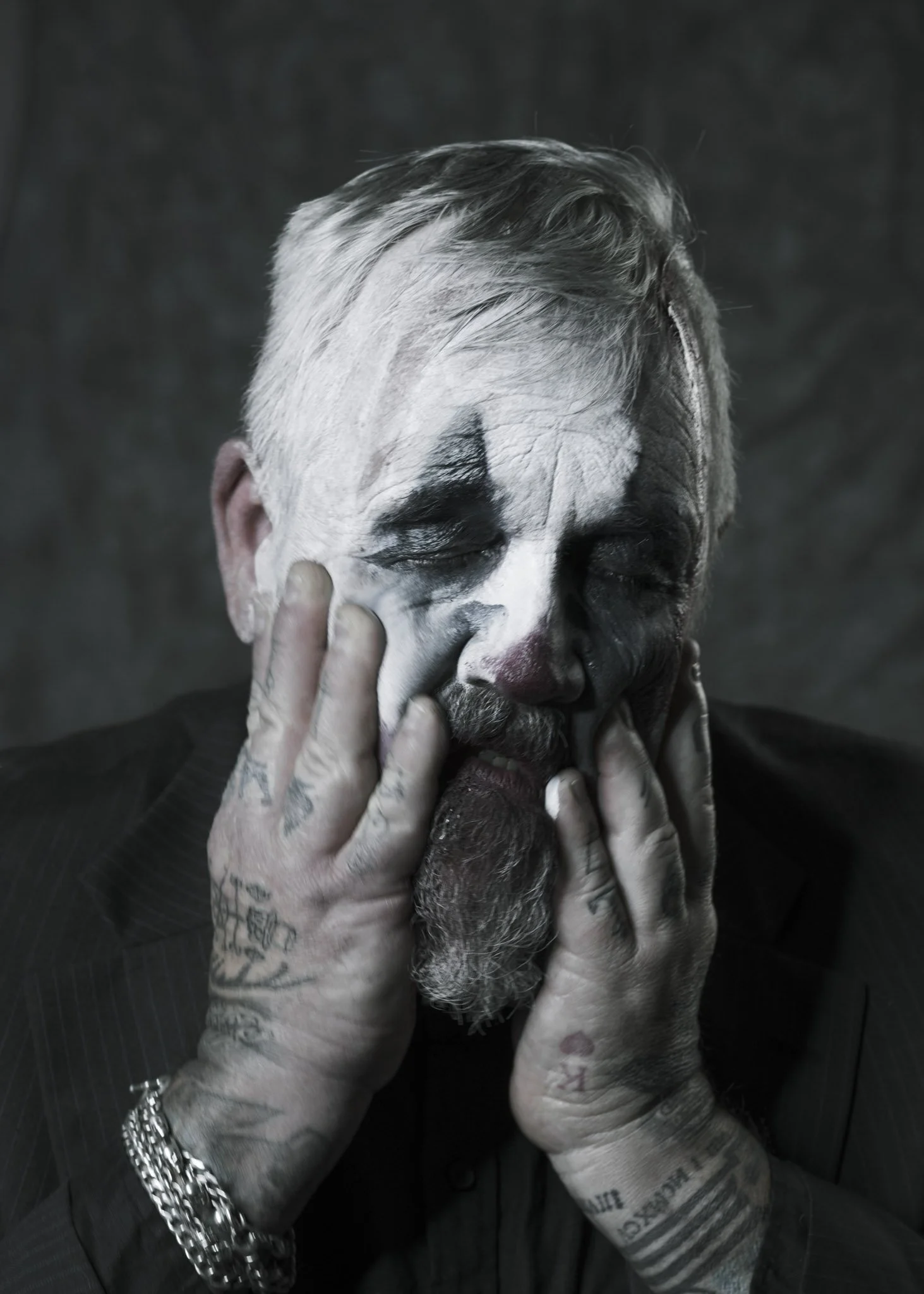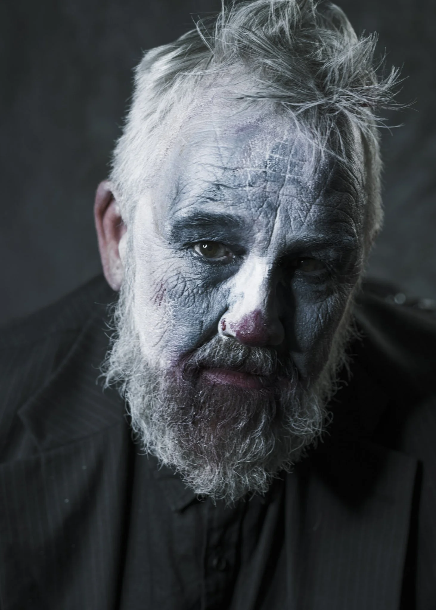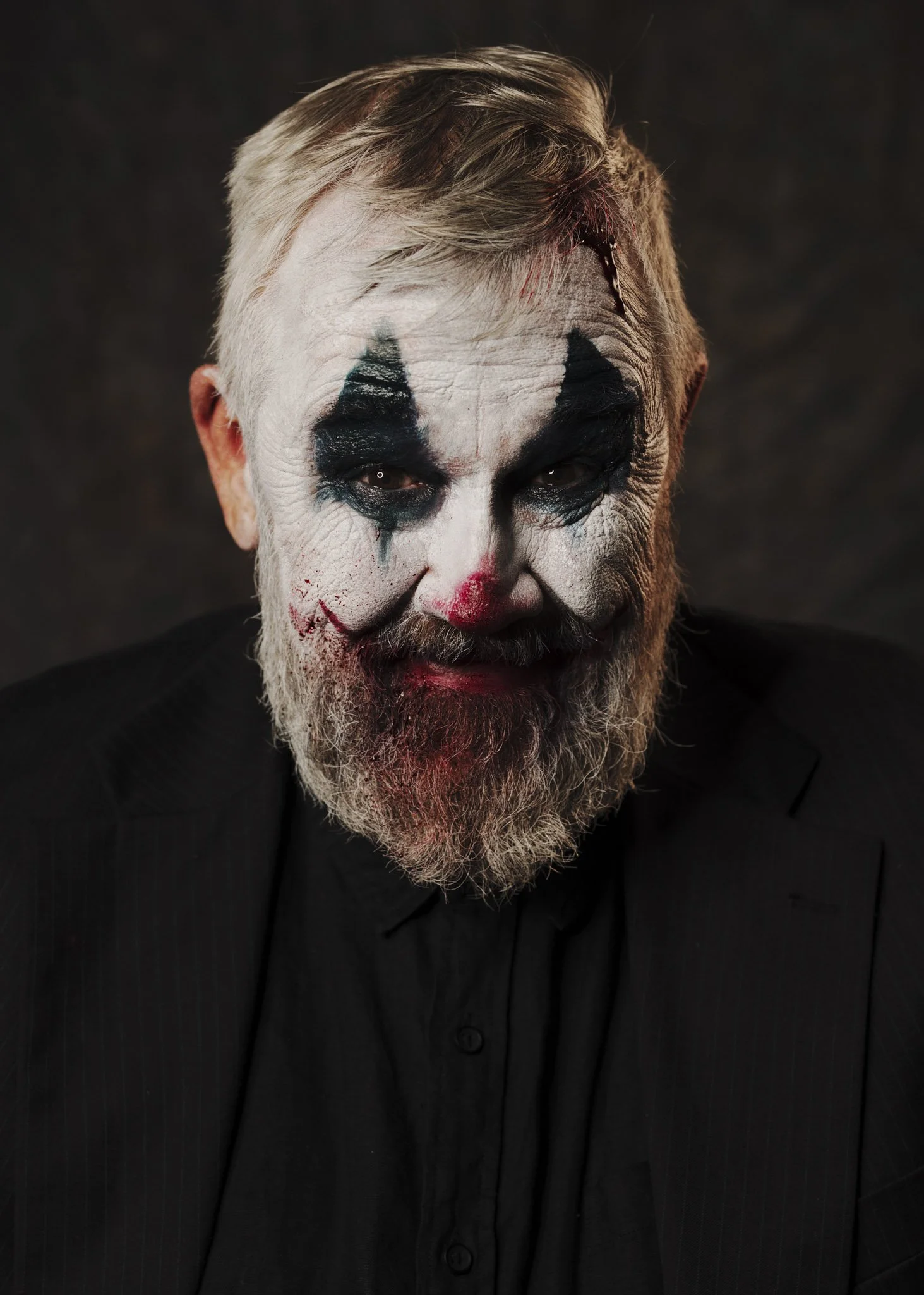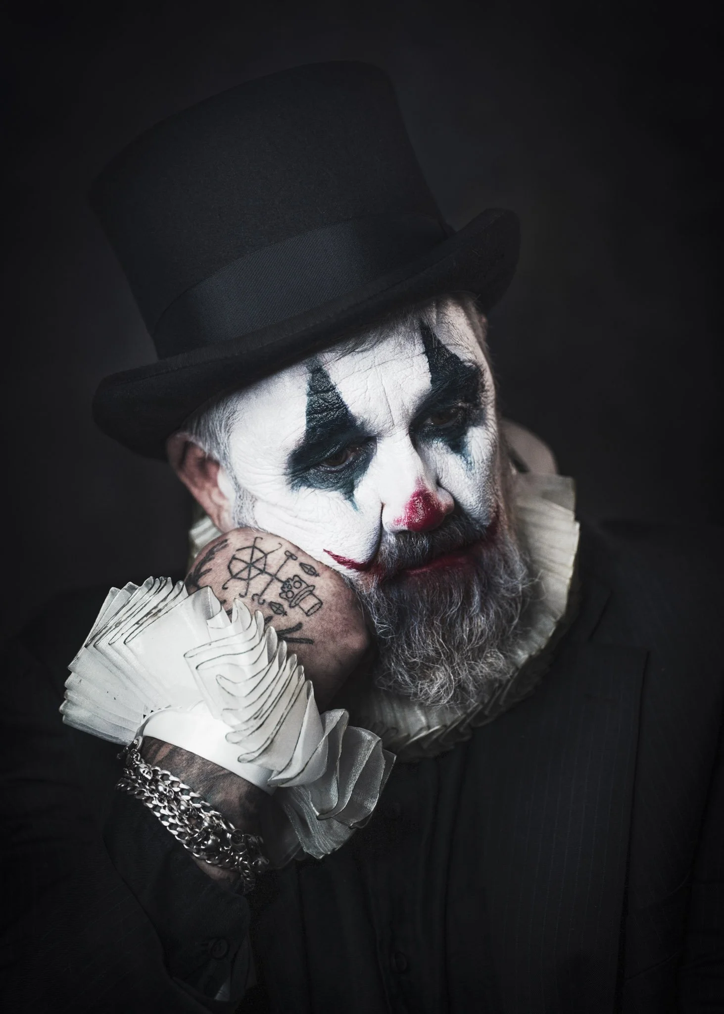 This isn’t a “creepy clown” set. It’s a tragedy in costume, a character study told through micro-shifts in the face and the weight of shadow. The darkness is deliberate. The restraint is deliberate. The mood is the story.