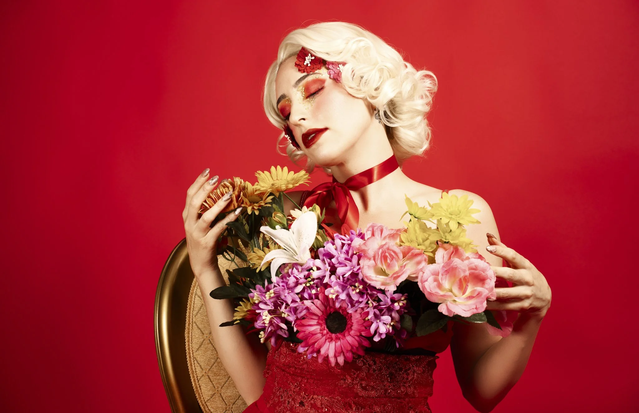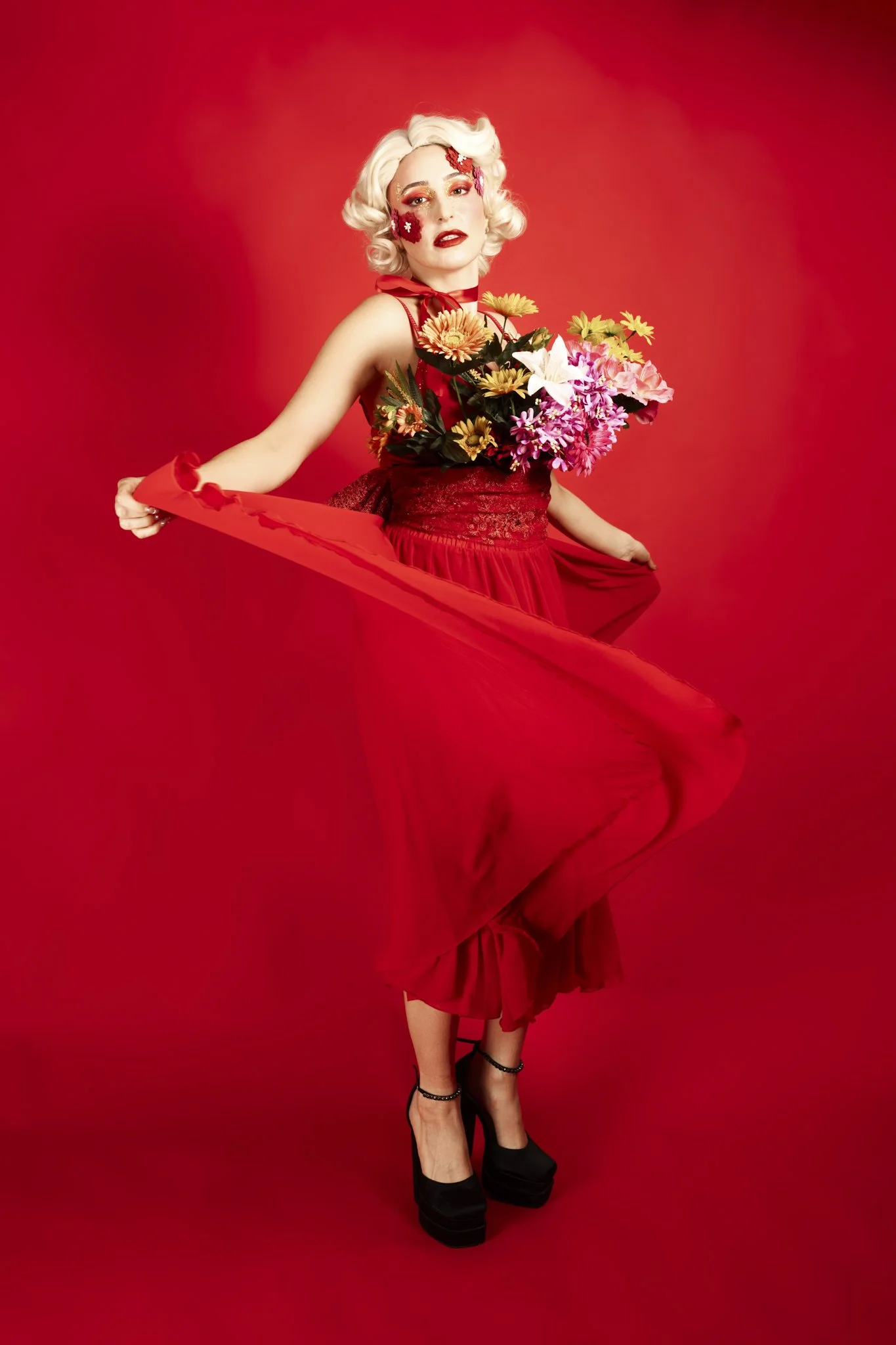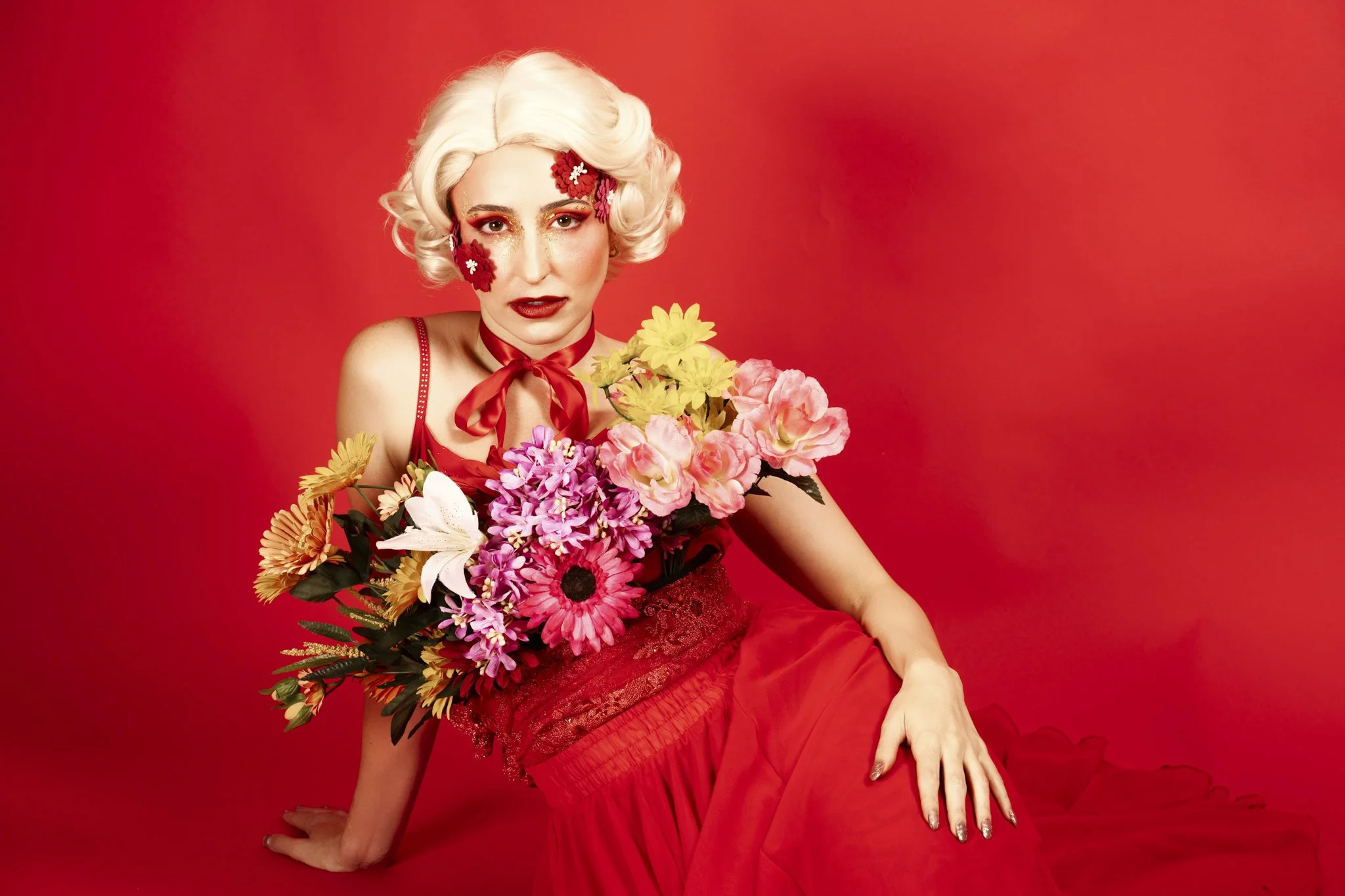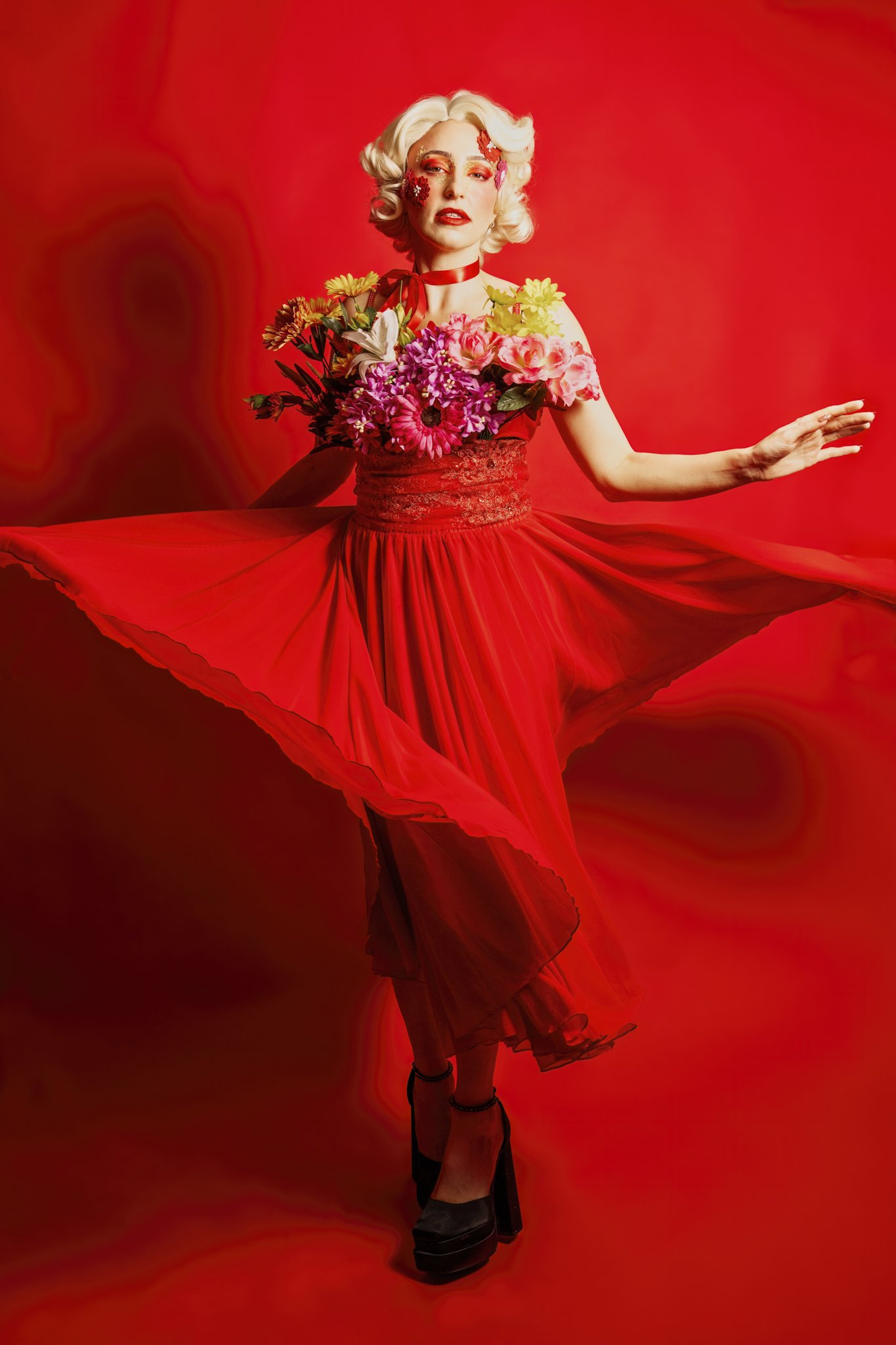The idea was to push colour and form to the edge, embracing excess without losing control. Everything was intentional, from the shade of red to the placement of petals and ribbon, creating images that feel both romantic and powerful.