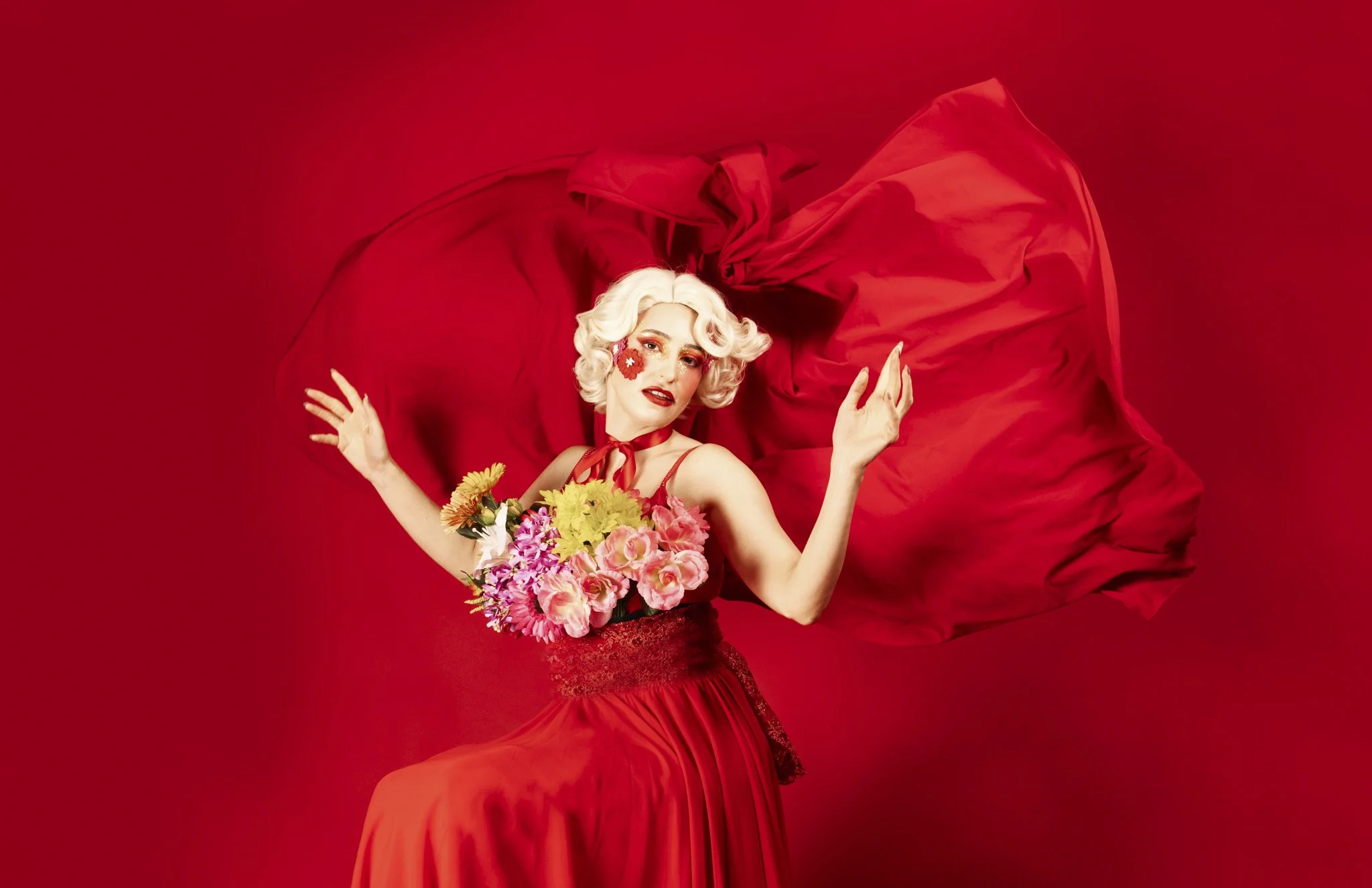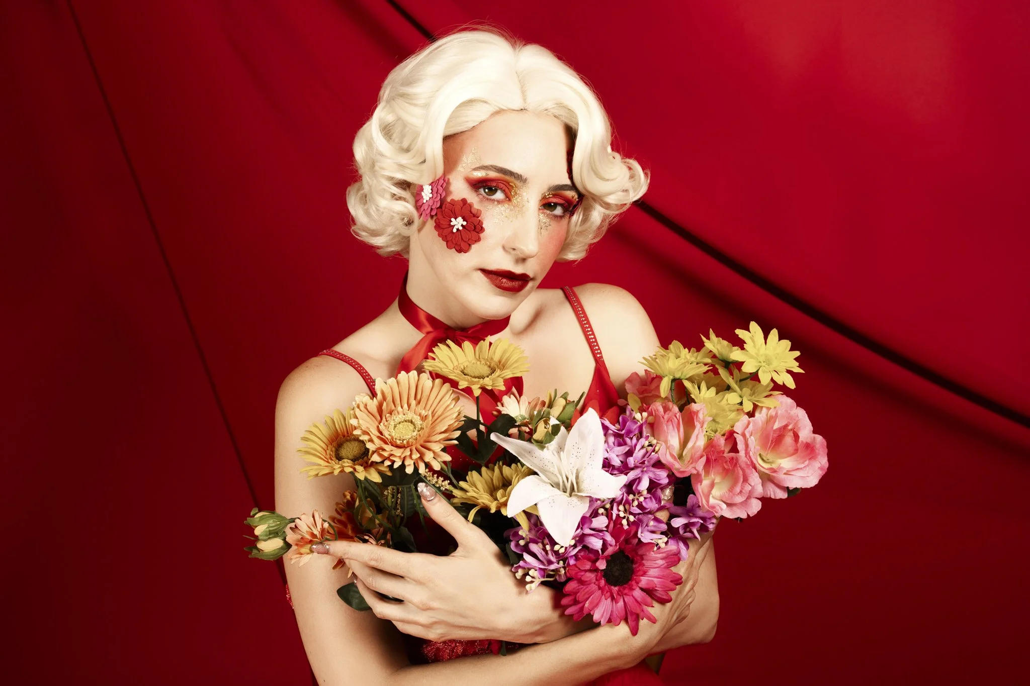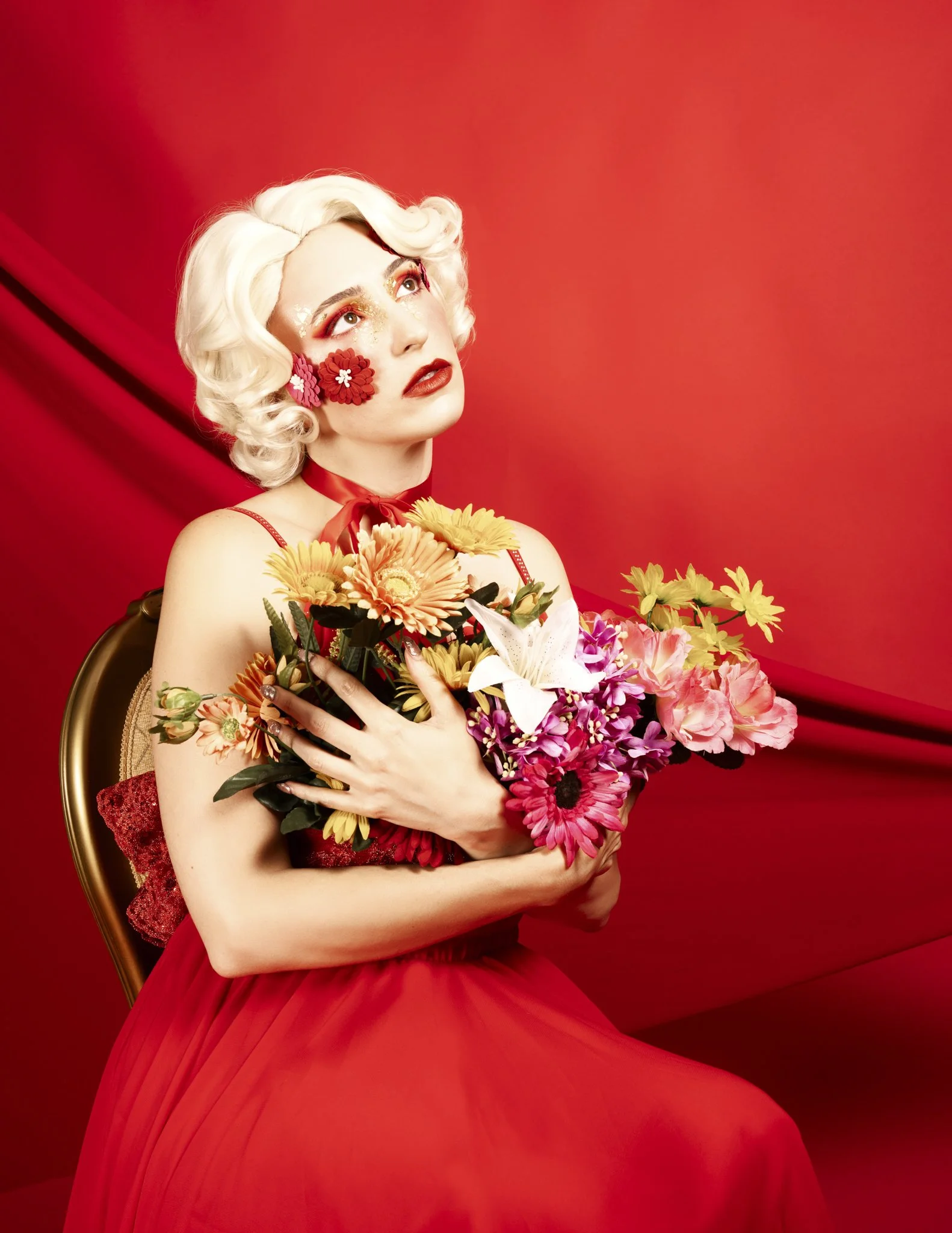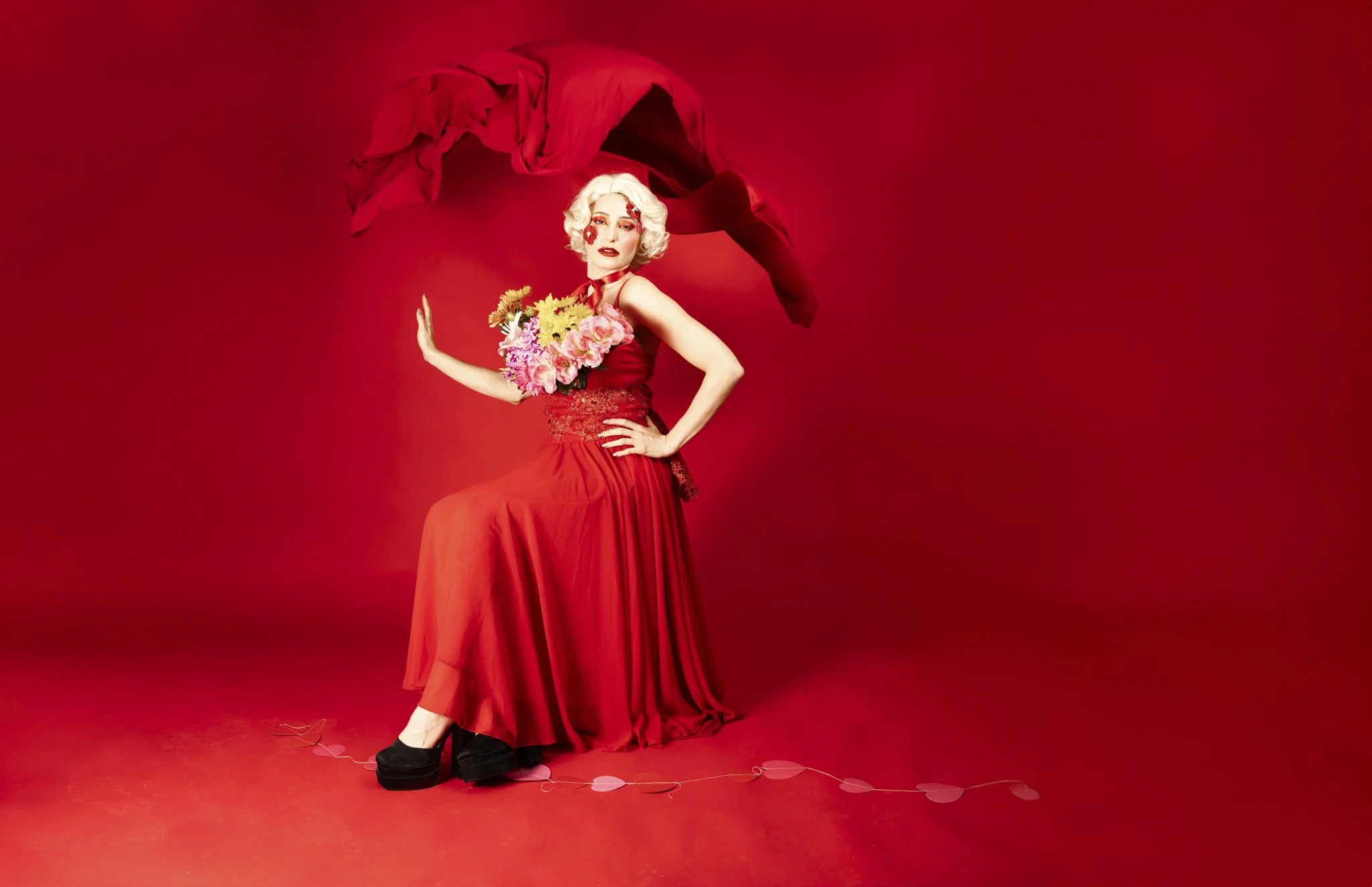 The idea was to push colour and form to the edge, embracing excess without losing control. Everything was intentional, from the shade of red to the placement of petals and ribbon, creating images that feel both romantic and powerful.