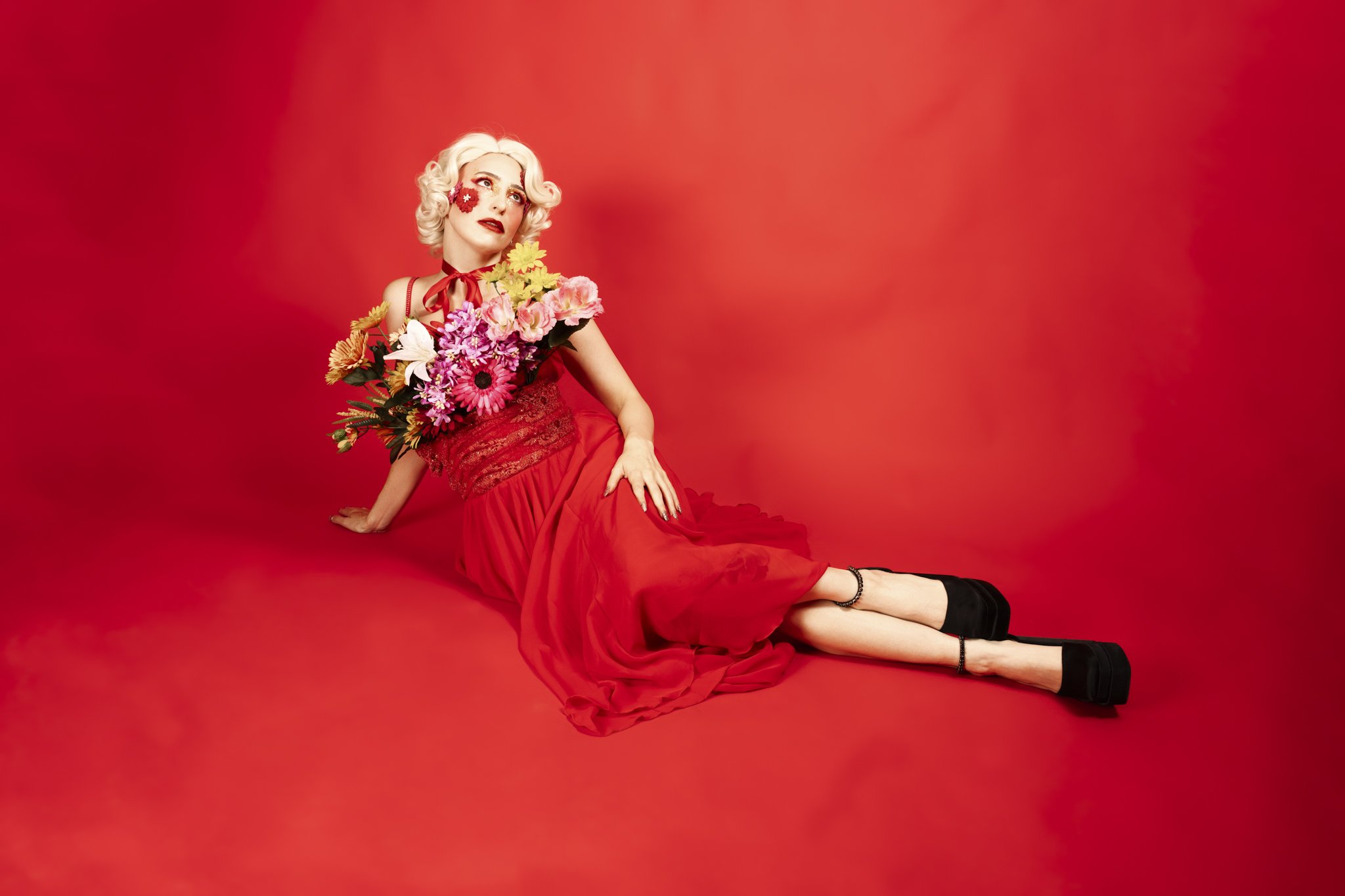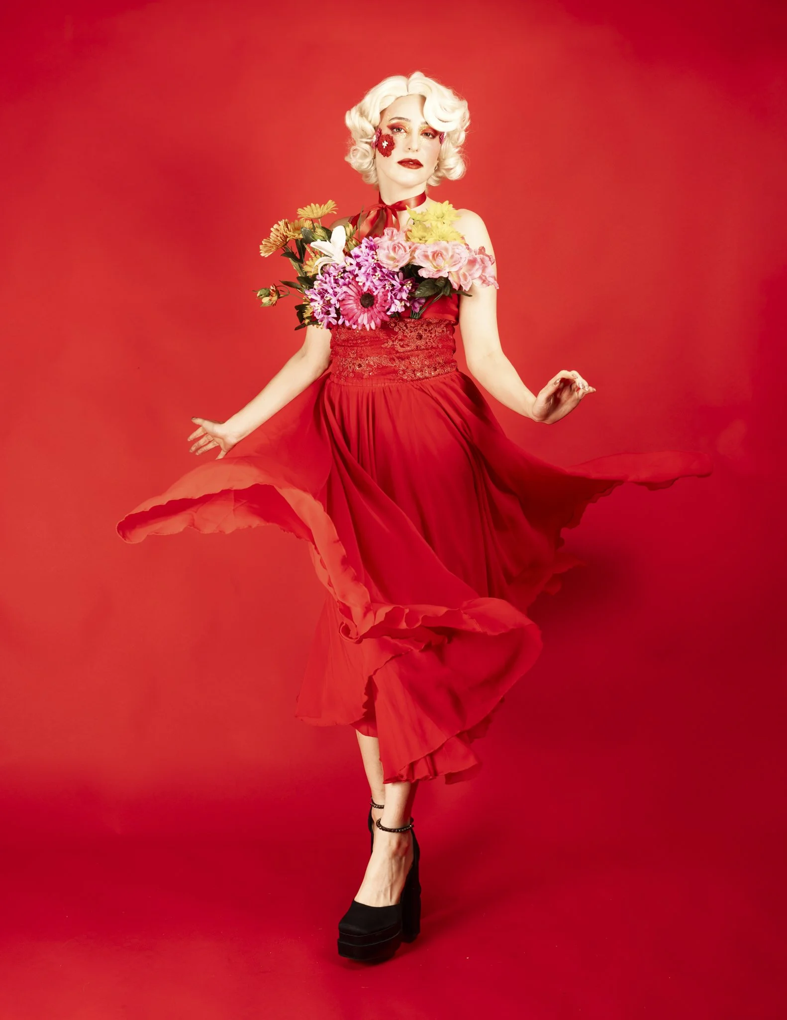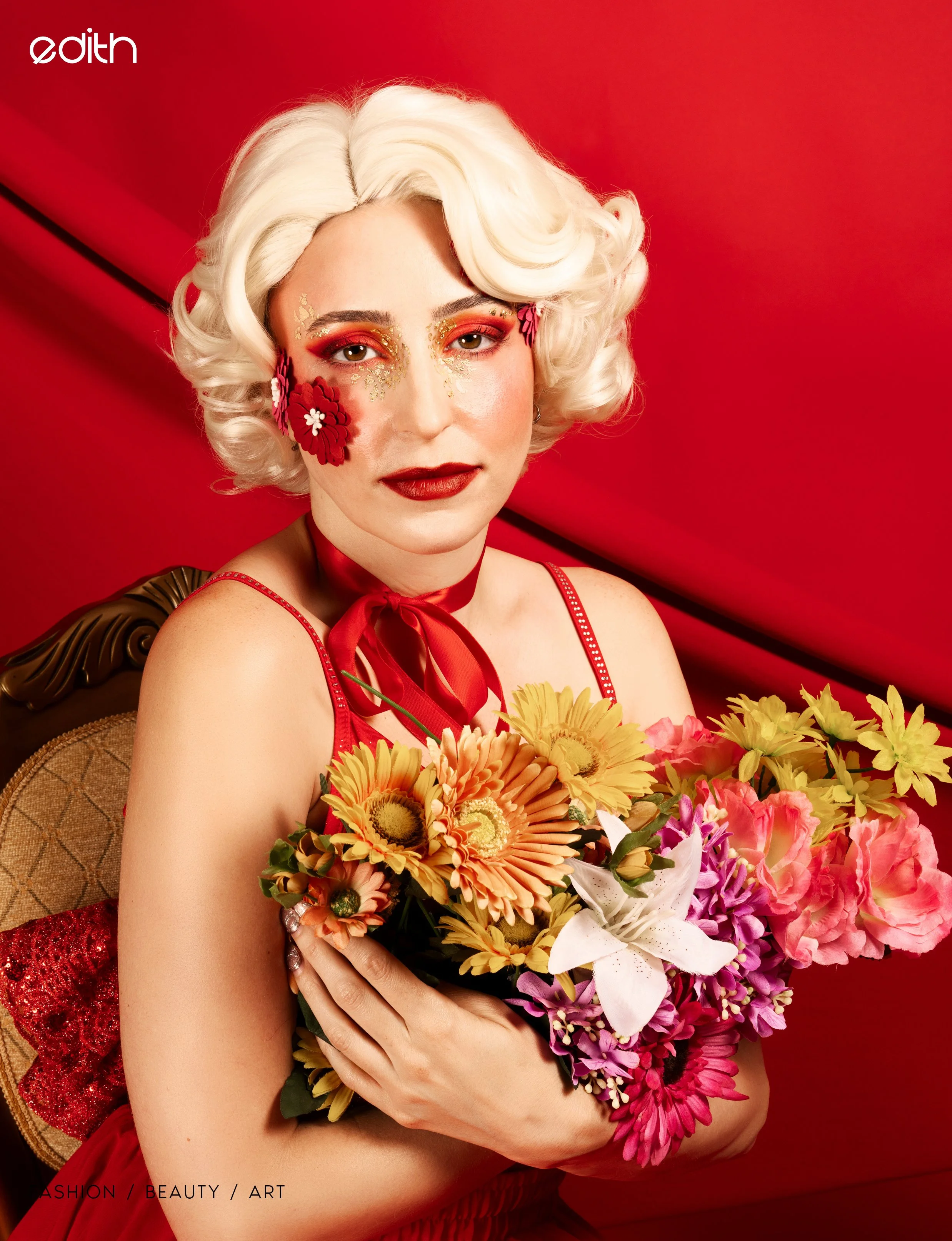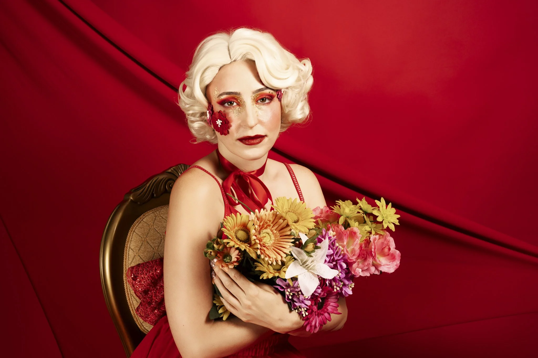 The idea was to push colour and form to the edge, embracing excess without losing control. Everything was intentional, from the shade of red to the placement of petals and ribbon, creating images that feel both romantic and powerful.