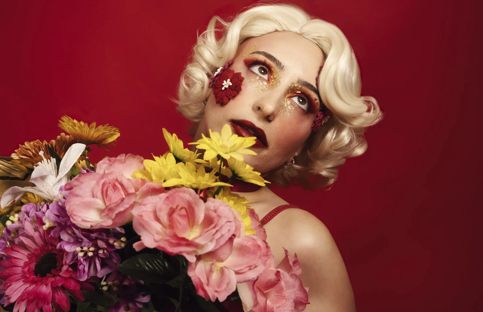 This shoot was a true collaboration. Jolie’s vision for turning Jesi into a floral arrangement pushed the concept beyond makeup into full character creation. Every element worked together, hair, makeup, florals, wardrobe, and lighting, to support the story.