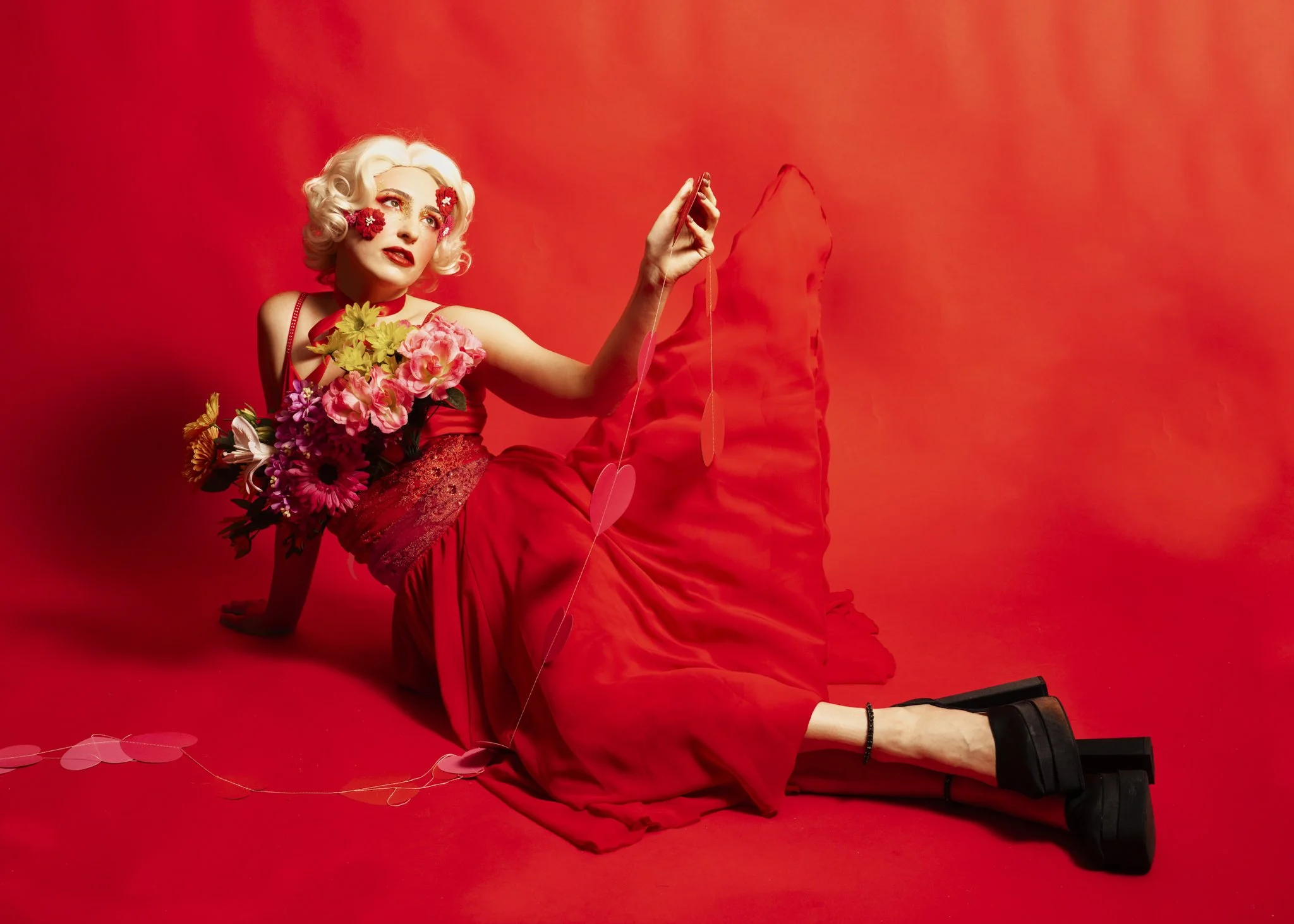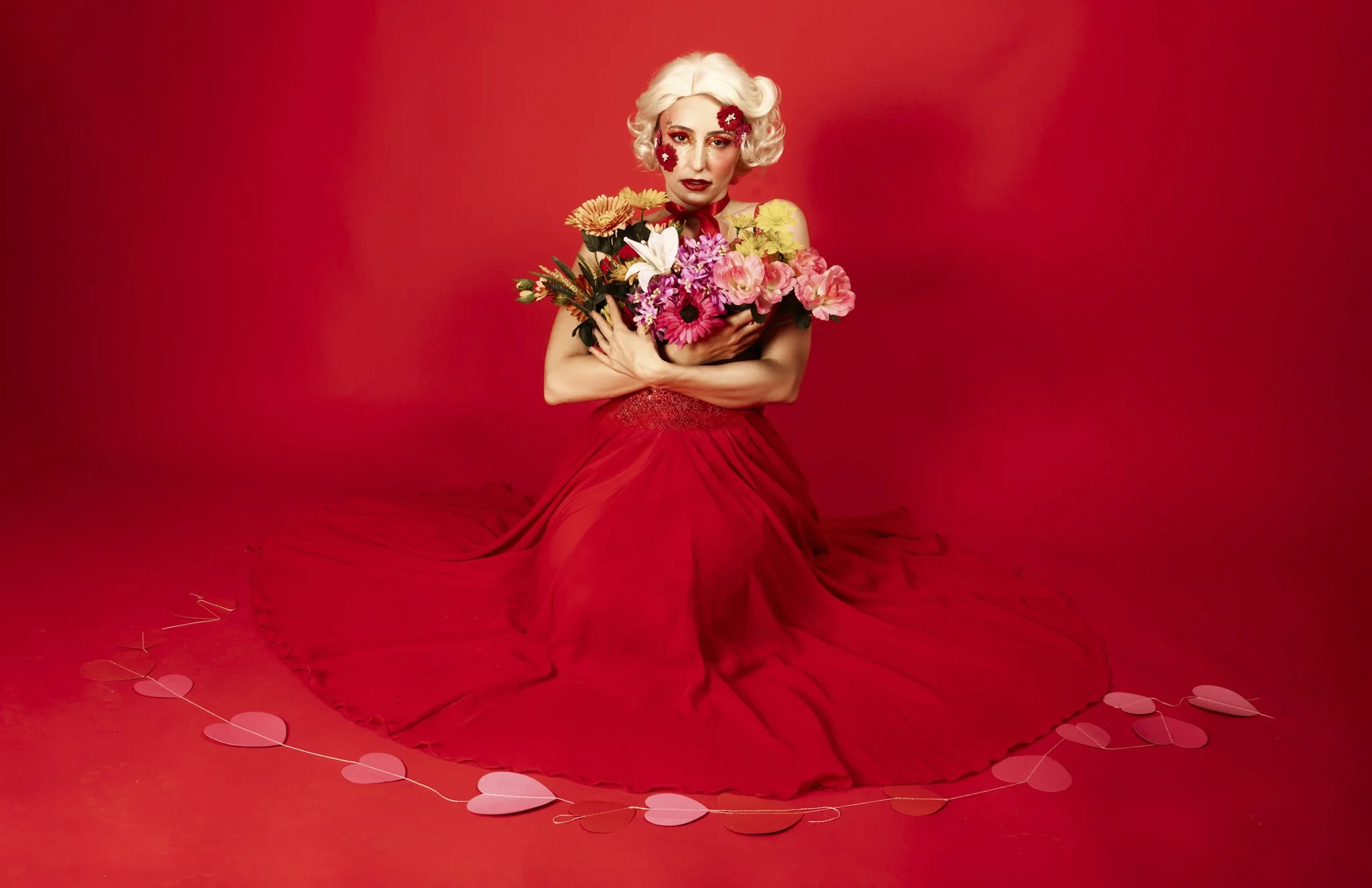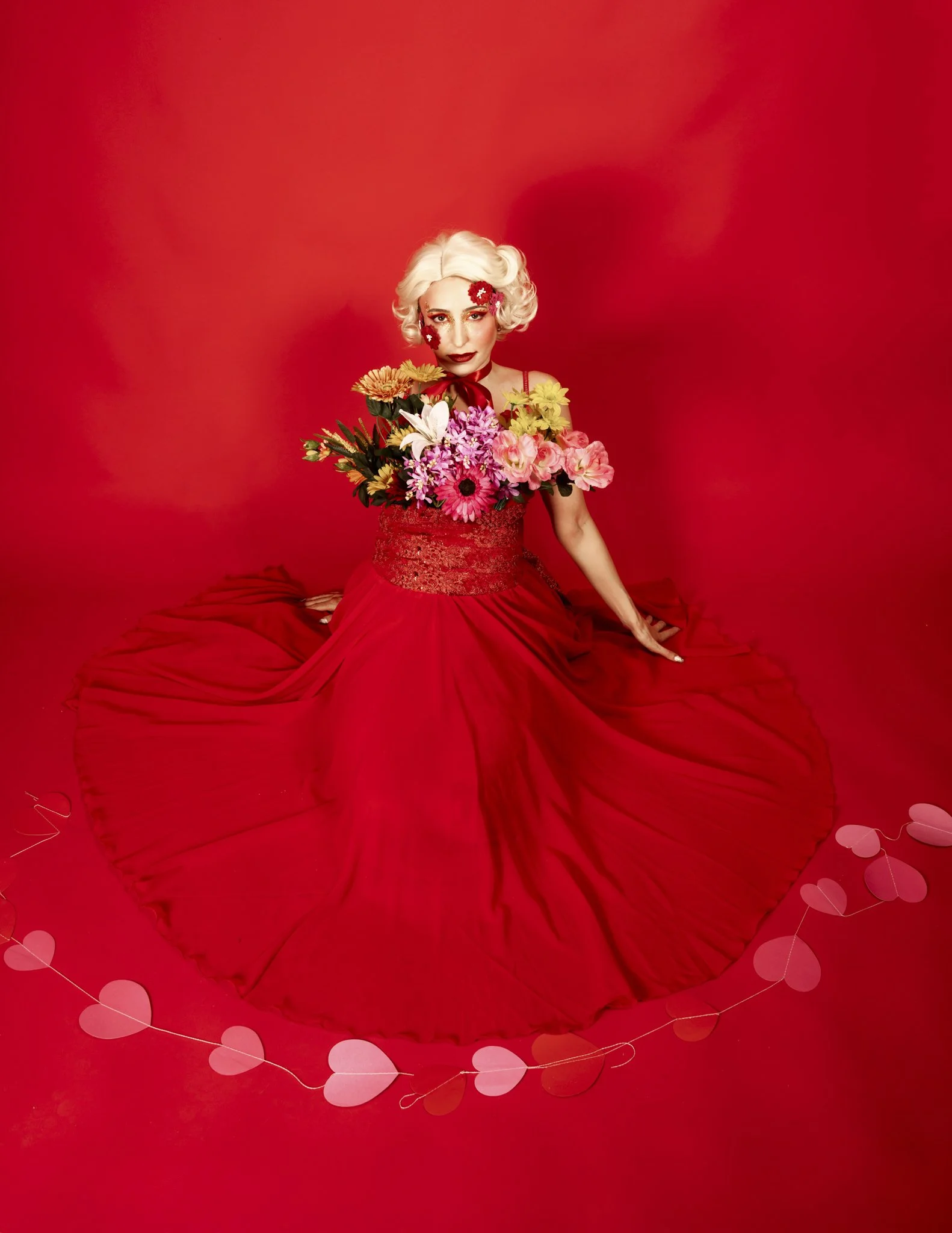 Rather than hearts and roses in the usual sense, this concept turns the model into the gift itself. Jesi becomes a human flower bouquet, wrapped, adorned, and styled as something precious, dramatic, and just a little surreal.