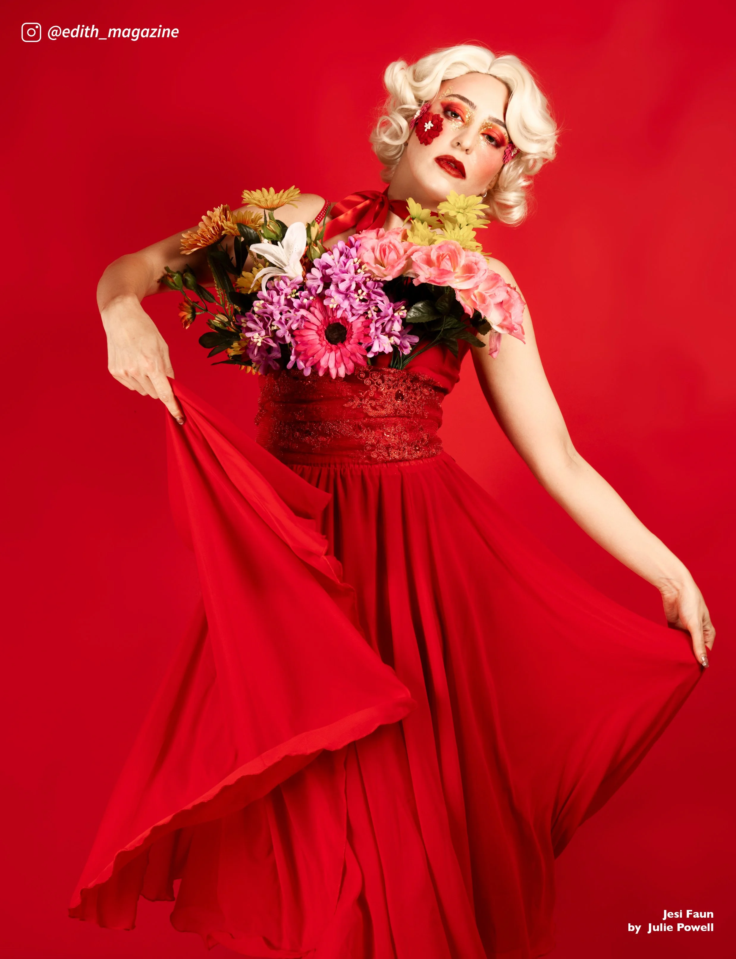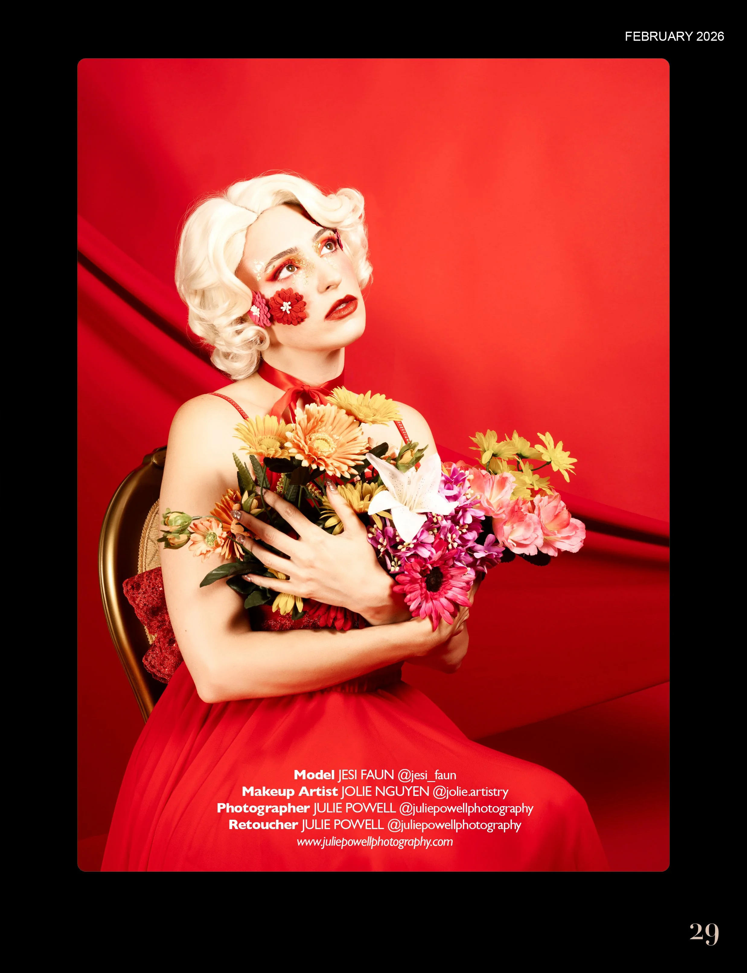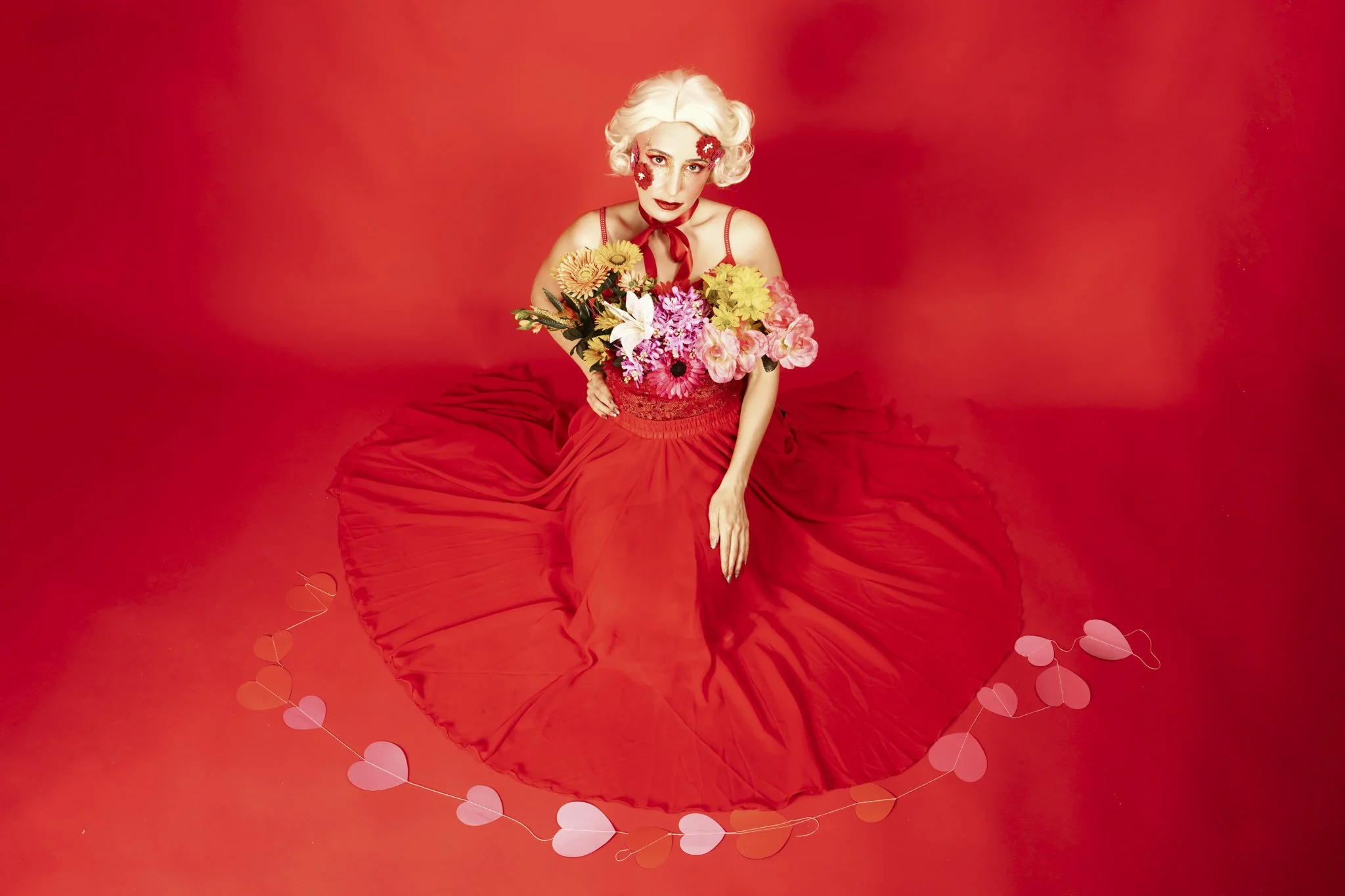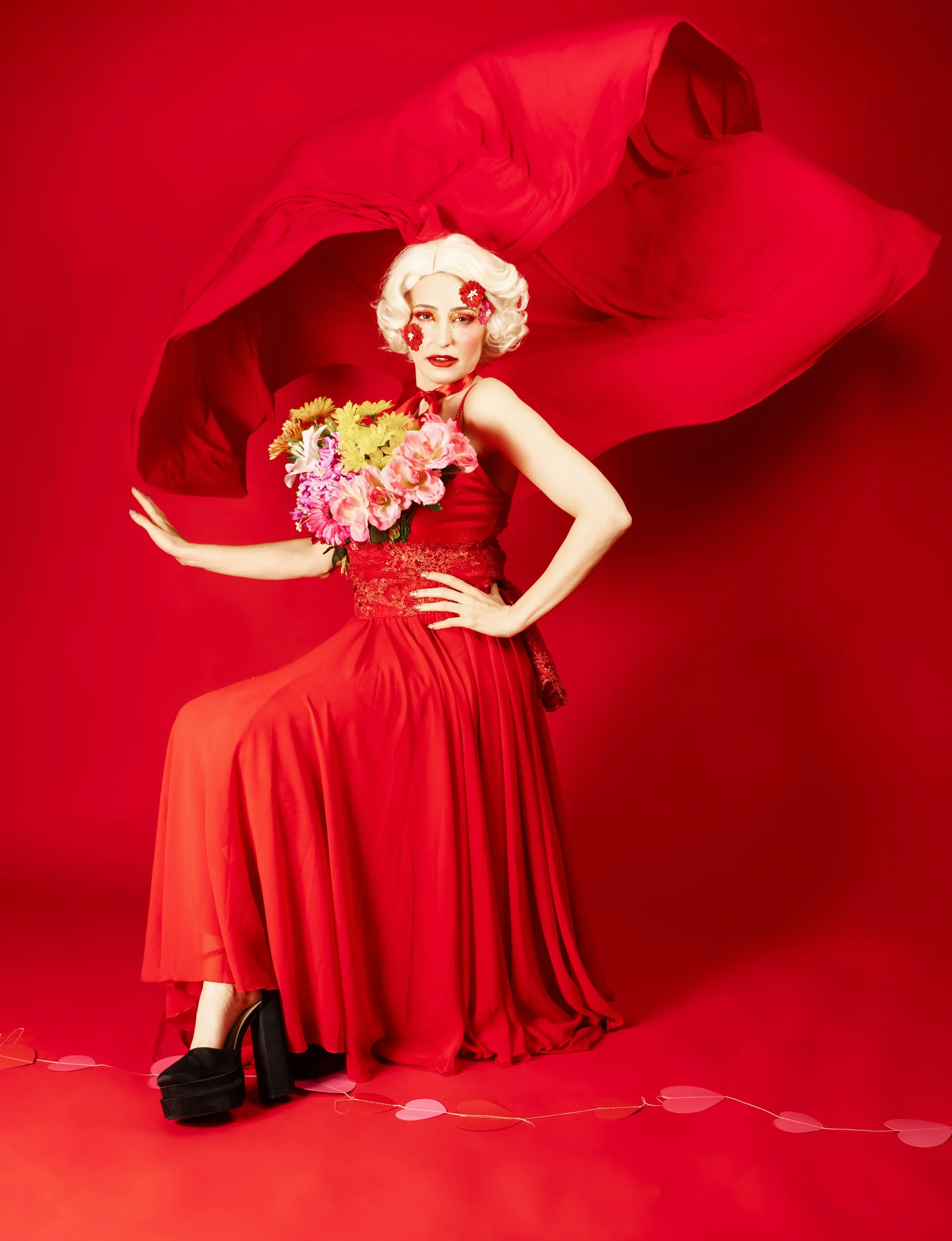 Rather than hearts and roses in the usual sense, this concept turns the model into the gift itself. Jesi becomes a human flower bouquet, wrapped, adorned, and styled as something precious, dramatic, and just a little surreal.