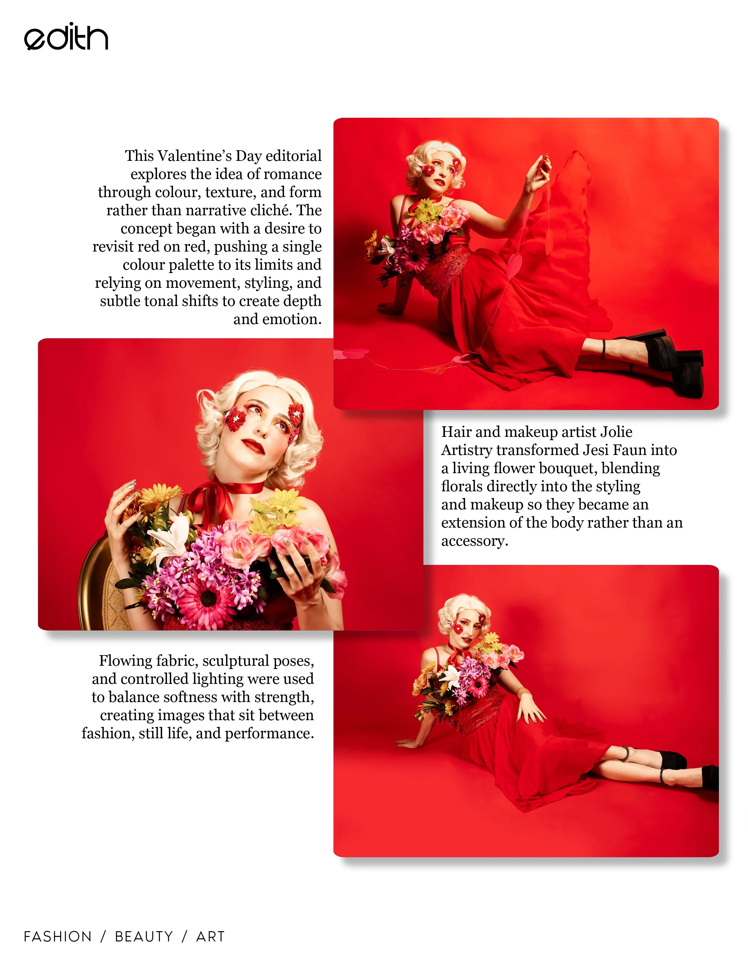 This shoot takes a playful but striking approach to Valentine’s imagery, stripping away clichés and replacing them with something graphic, sculptural, and unapologetically bold. Red on red. Texture on texture. A living, breathing arrangement.