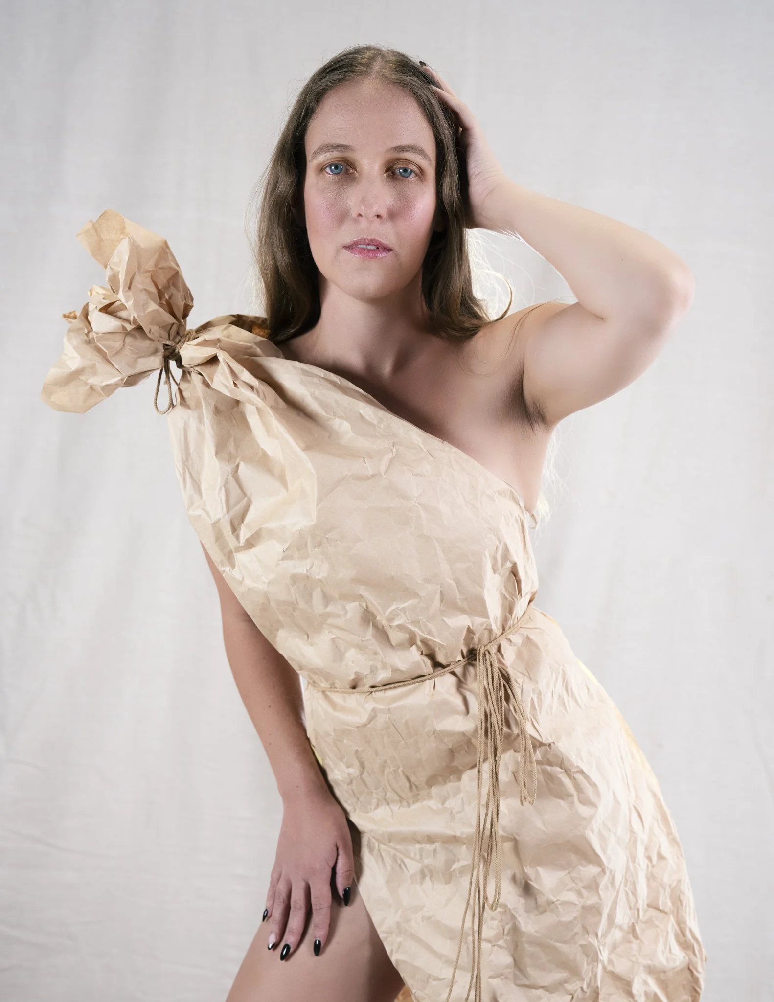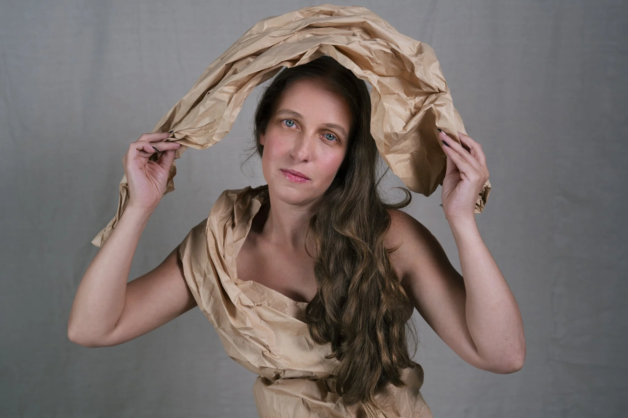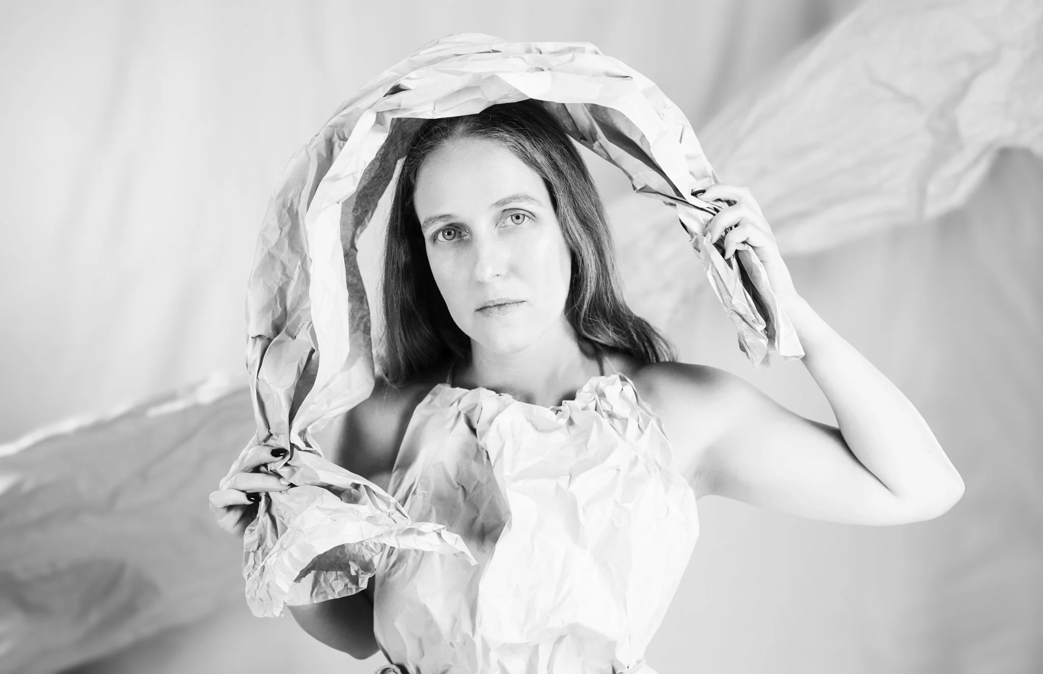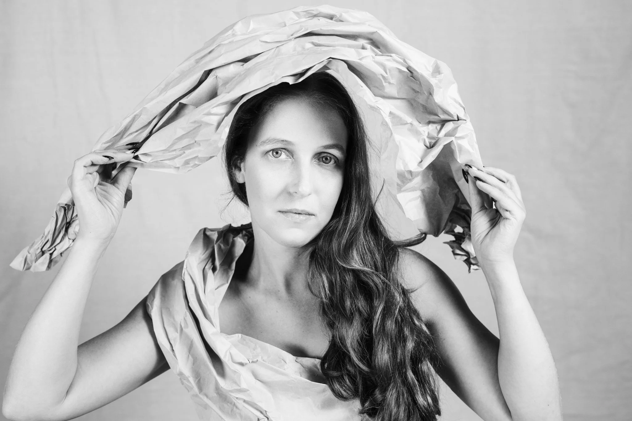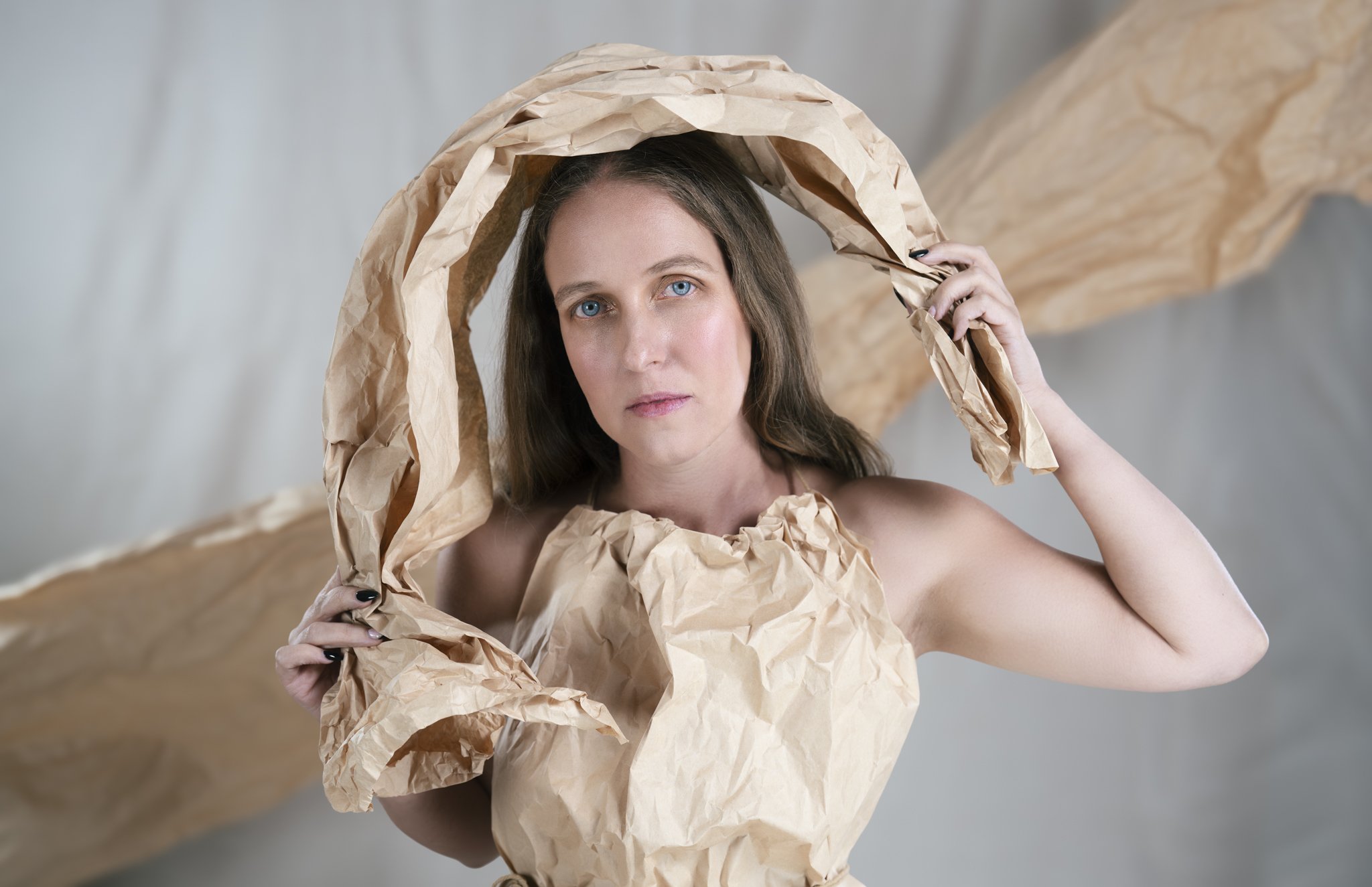 For this session, Lisa came in with a vision and together we worked through how to shape that idea into a finished shoot. Using paper as both styling and texture, we created a range of looks that shifted from soft and sculptural to bold and editorial. Every fold caught the light differently, every movement changed the mood, and every setup gave us something new to play with.